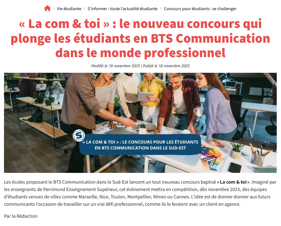 Organisé par Perrimond pour la première édition en 2025 – 2026, le concours La com&toi met les étudiants de BTS Communication du Sud au défi de proposer une stratégie de communication répondant à un brief d’annonceur en conditions réelles.